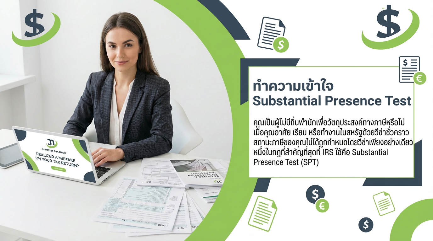 เมื่อคุณอาศัย เรียน หรือทำงานในสหรัฐด้วยวีซ่าชั่วคราว สถานะภาษีของคุณไม่ได้ถูกกำหนดโดยวีซ่าเพียงอย่างเดียว หนึ่งในกฎที่สำคัญที่สุดที่ IRS ใช้คือ Substantial Presence Test (SPT) การเข้าใจผิดเกี่ยวกับการทดสอบนี้เป็นหนึ่งในสาเหตุที่พบบ่อยที่สุดที่ผู้ไม่มีถิ่นพำนักยื่นแบบภาษีผิด