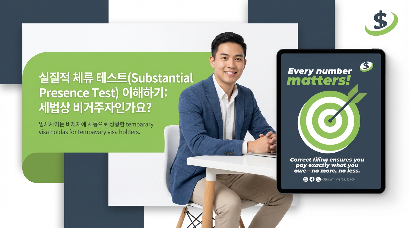 임시 비자로 미국에서 거주하거나 공부하거나 일하는 경우, 세금상 신분은 비자만으로 결정되지 않습니다. IRS가 사용하는 가장 중요한 규정 중 하나는 실질적 체류 테스트(Substantial Presence Test, SPT) 입니다. 이 테스트를 잘못 이해하는 것은 비거주자가 잘못된 세금 신고서를 제출하는 가장 흔한 이유 중 하나입니다.