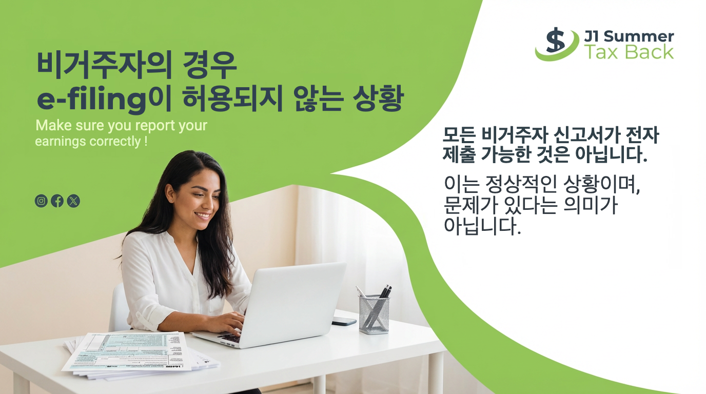 이 단계가 끝난 후에야 전자 제출 가능 여부를 판단할 수 있습니다. 사람들이 혼자 신고하려고 할 때 가장 많은 실수가 발생하는 부분이 바로 여기입니다. J1 Summer Tax Back은 전자 제출 자격이 없는데도 e-file을 시도하는 것이 나중에 심각한 문제로 이어질 수 있기 때문에 이 단계를 특히 중요하게 다룹니다.